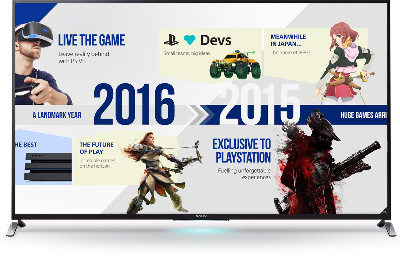 Scroll the below to view the full carousel as displayed on a TV. The blue “Did You Know?” bubbles expanded on hover to display a fun fact about the PS4. All the years, and big and small text areas were clickable and took the user to a selection of games or videos to purchase in that category.